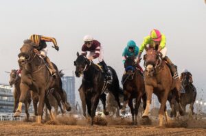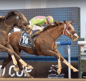 1. Sibelius neck-in-neck on his way to winning the 2023 $2M Grade 1 Dubai Golden Shaheen. ©Mathea Kelley Photography