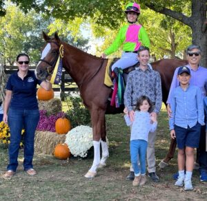 Photo 1: Sibelius and Alison O’Dwyer pose for photos after the 2025 Thoroughbred Makeover with from left Delia Nash, Jerry O’Dwyer, Jun Park, and other family members who came to cheer on the retired racehorse.